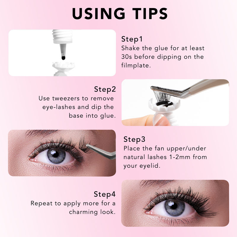 Proces prijave je brz i jednostavan. Započnite odabirom željenih nakupina trepavica i postavljanjem na ravnu površinu. Zatim primijenite malu količinu našeg DIY LASH CLUSTER ljepila na bazu svakog klastera. Dopustite da se DIY ljepilo za trepavice nasuči nekoliko sekundi, a zatim lagano pritisnite nakupine na svoje prirodne trepavice.